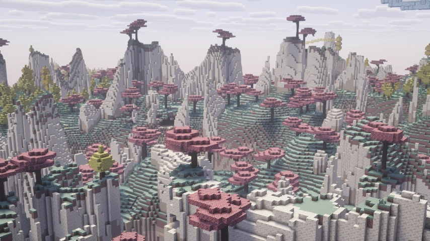A rocky craglands biomes dotted with Menth Trees and spires of Calcite