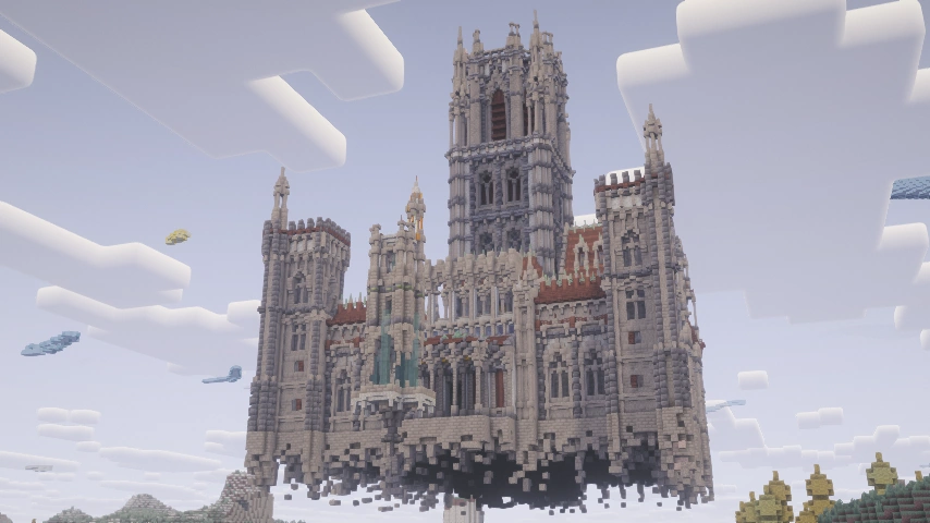 A floating castle full of opulence, guarded by animated statues